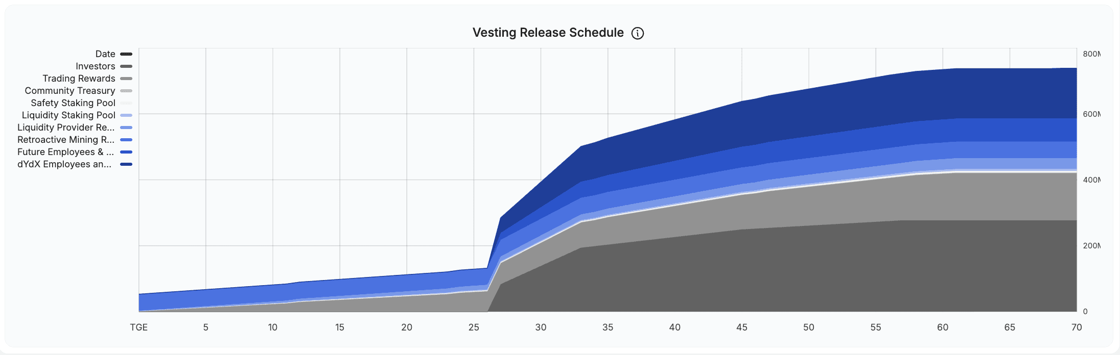 Community Treasury: 26.1% (261.1 million DYDX) controlled by governance for ecosystem development