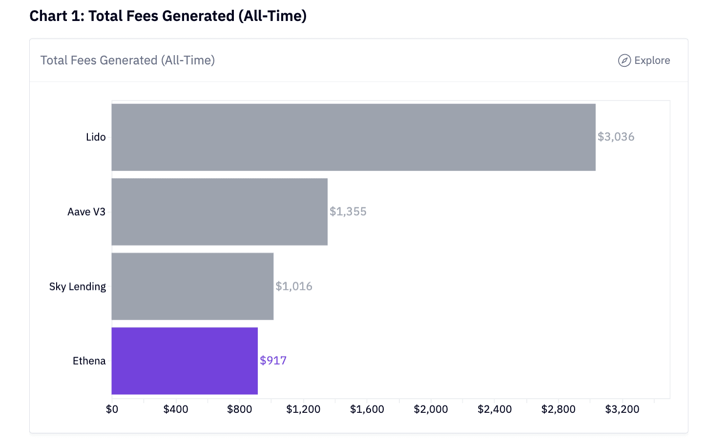 Lido leads at $3B, then Aave V3 ($1.4B), Sky Lending ($1B), Ethena ($917M). Shows Ethena is #4 in total fees but youngest protocol by far.