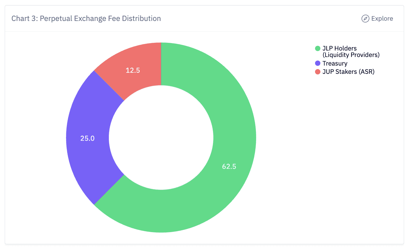 GMX (GMX): Distributes 70% of fees to GLP liquidity providers, 30% to escrowed GMX stakers. This closely resembles Jupiter's model, with the difference being Jupiter's additional governance requirement for JUP stakers.