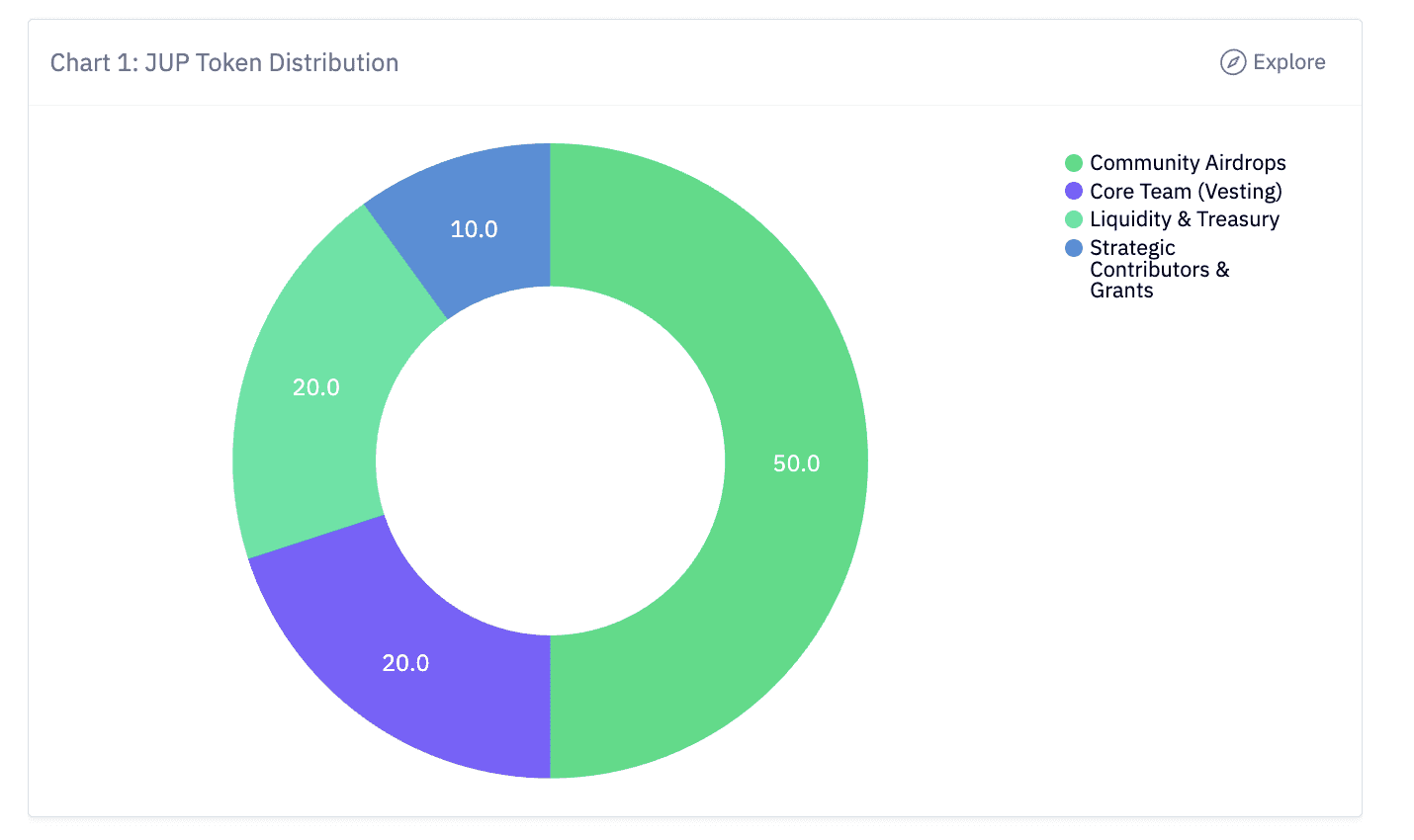 Jupiter allocated 50% of the 10 billion JUP supply to the community and 50% to team, contributors, and strategic reserves. The community portion focuses on rewarding users through multiple airdrop events called "Jupuary."