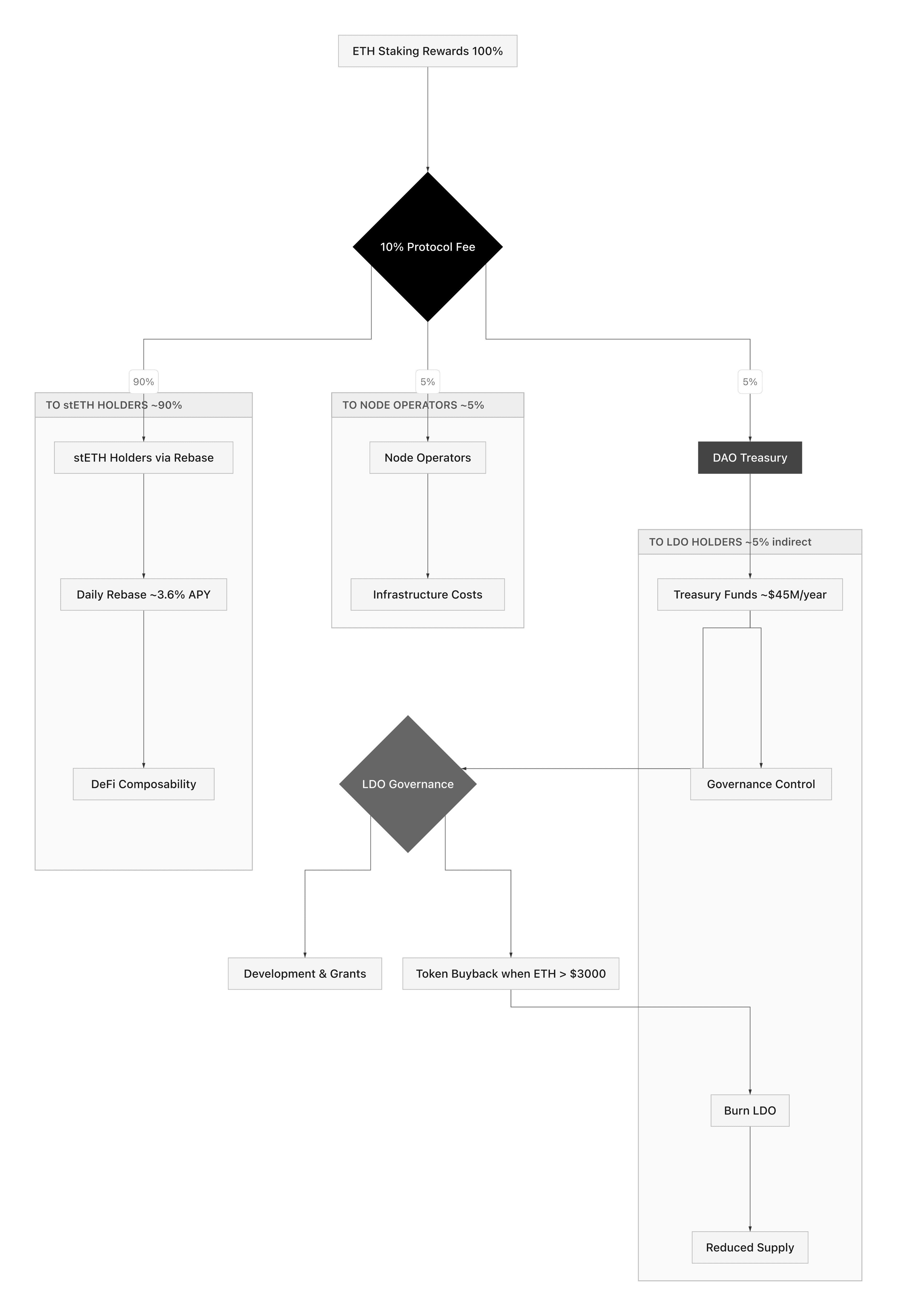 The LDO token captures value through governance control over treasury funds and protocol parameters. While LDO does not provide direct revenue distributions, token holders control approximately $45 million in annual treasury revenue and can vote on deployment strategies including development funding or token buybacks.