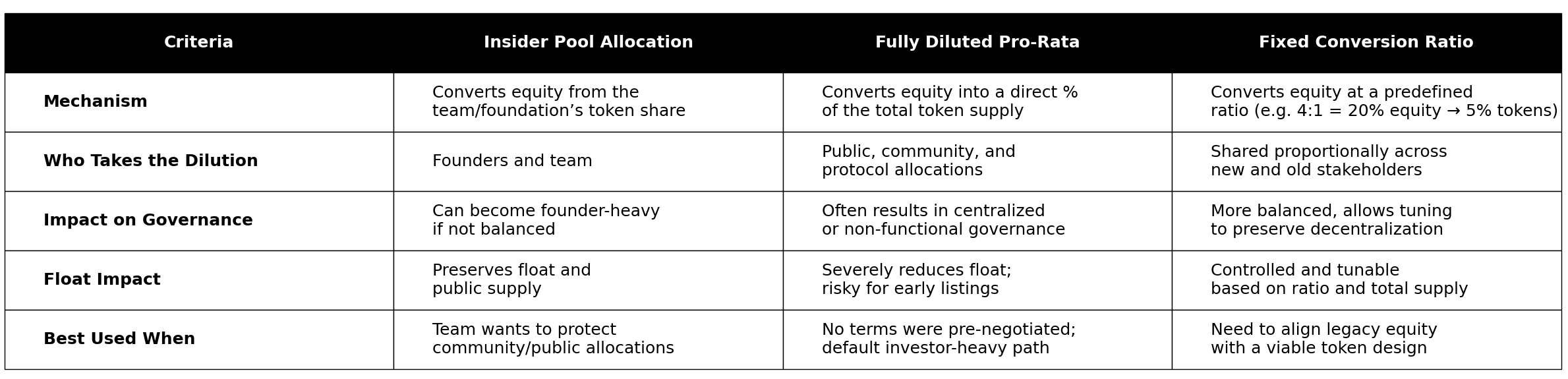 In this approach, the project defines a fixed percentage of the token supply for insiders (e.g. 20%, which is the market standard), and legacy equity holders take their allocation from within that slice. They don’t get additional tokens from community, public, or ecosystem allocations.