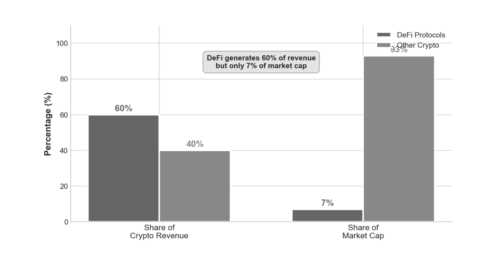 DeFi generates 60%+ of crypto revenue but only 7% of market cap, suggesting significant valuation disconnects for quality tokens with strong token value accrual.