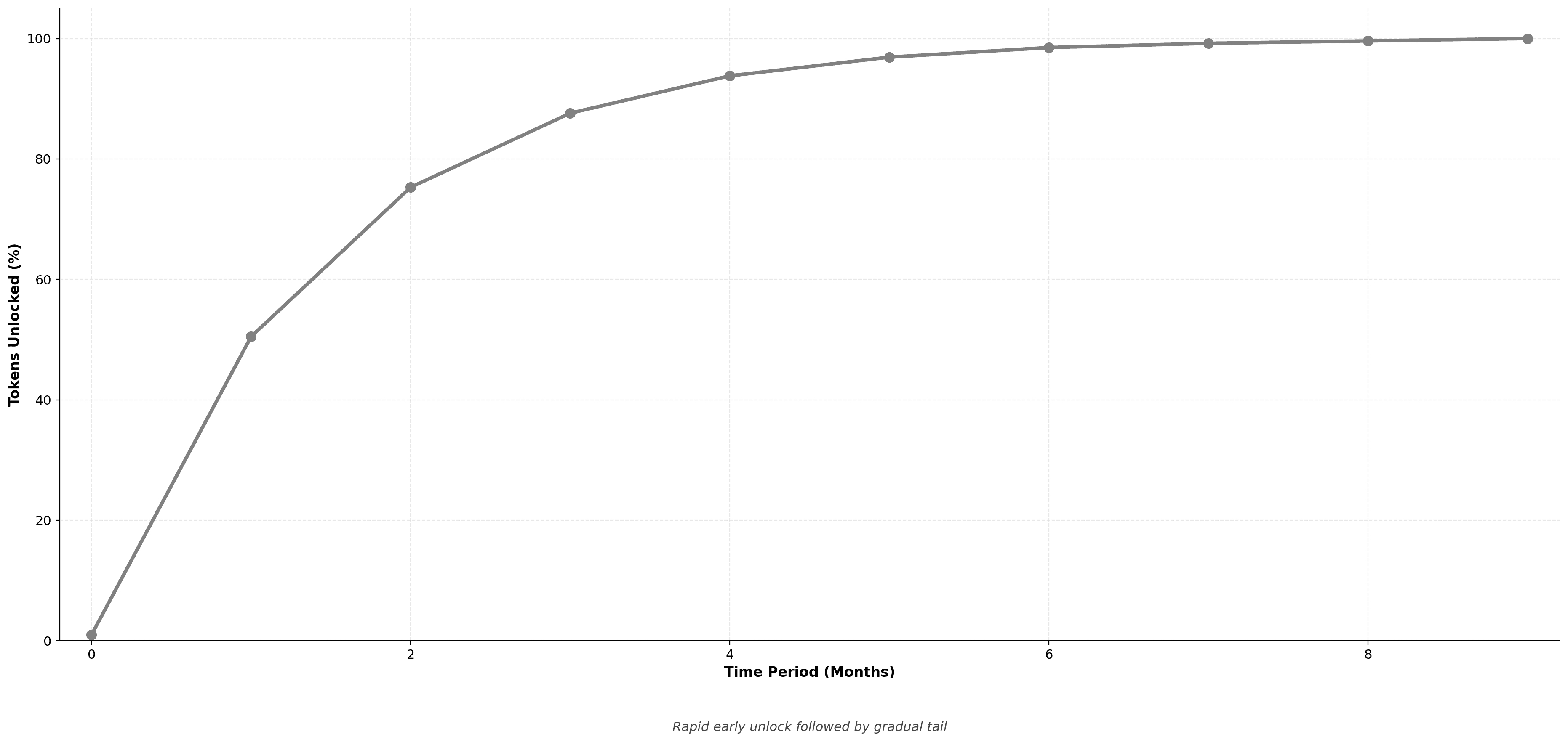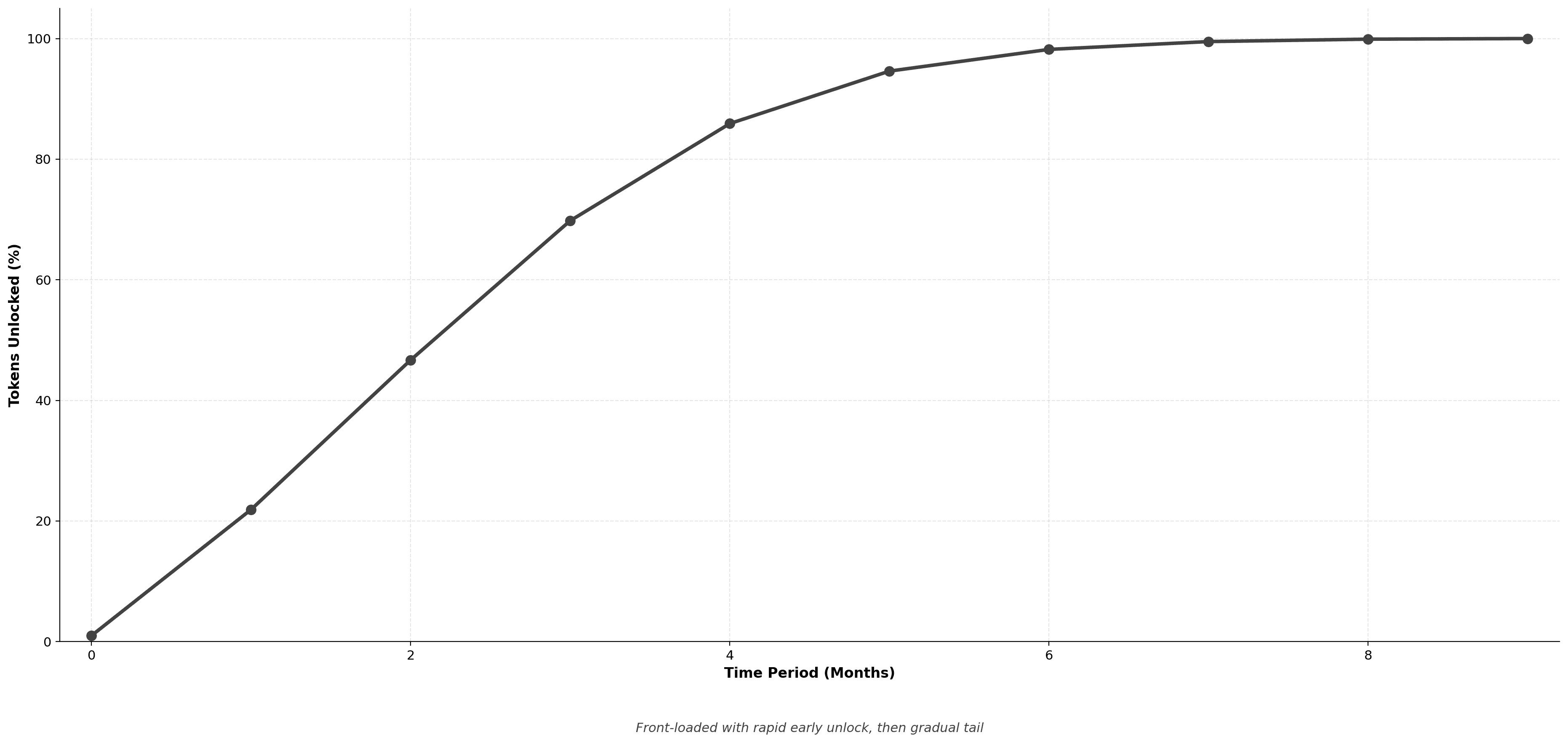 Front-loaded curve with rapid early unlocking that gradually tapers off. Majority of tokens vest in the first half of the period.