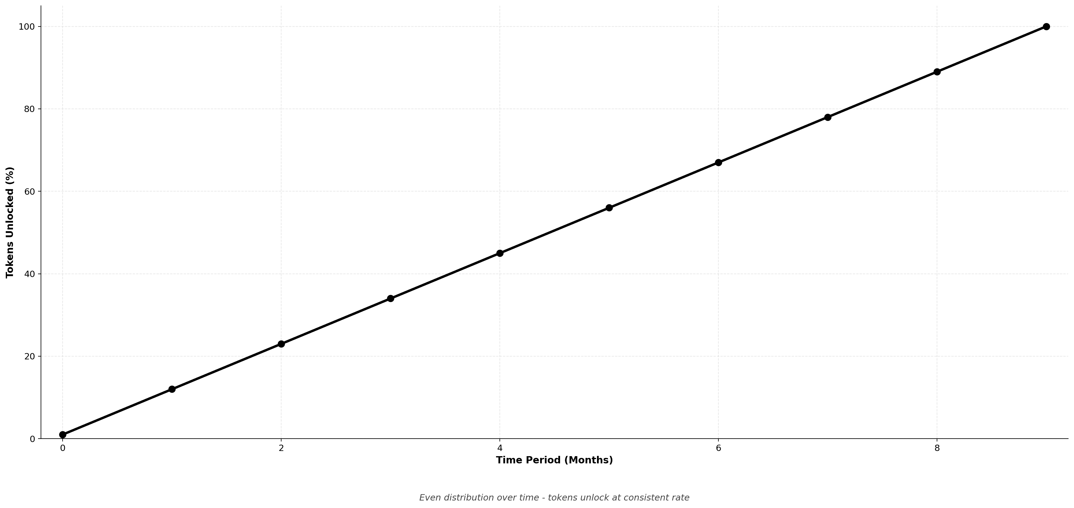 The baseline approach where tokens unlock at a constant rate throughout the vesting period. Each time interval releases the same percentage of total allocation.