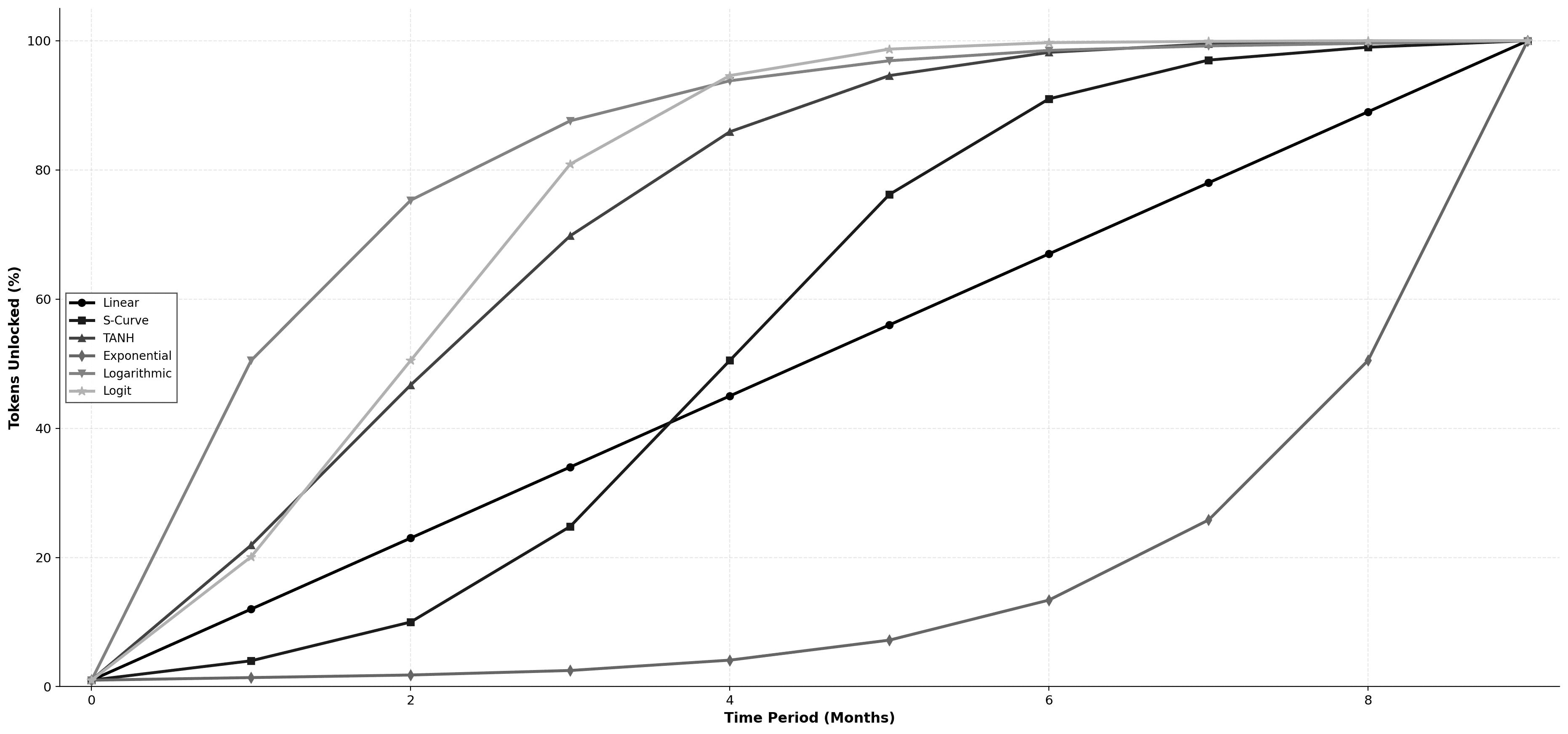 Different vesting curves (linear, S-curve, TANH, exponential, logarithmic, logit) create distinct unlock patterns—linear is standard, but alternative curves can optimize for specific strategic needs.