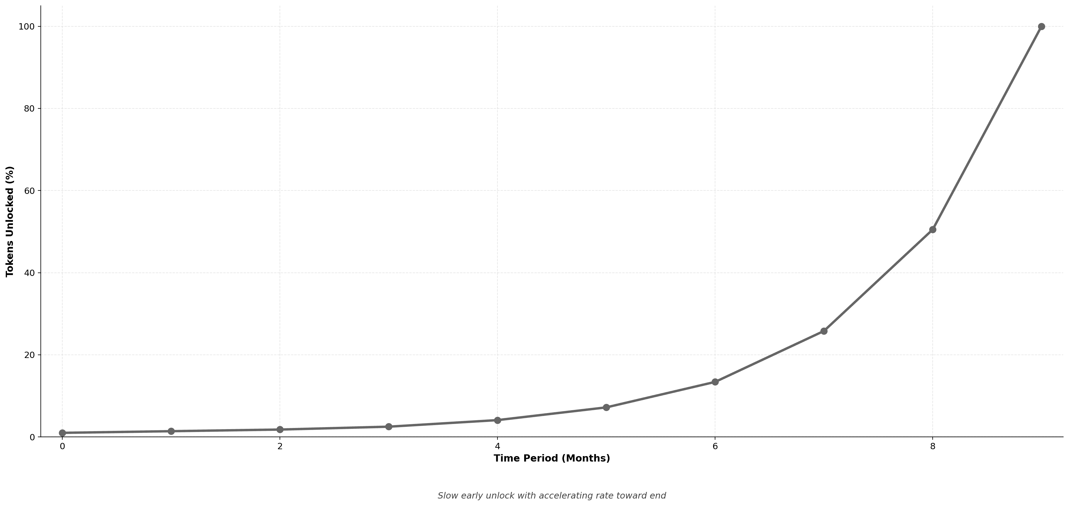 Minimal early unlocks with accelerating rate toward the end. Back-loaded structure where majority of tokens vest in final periods.