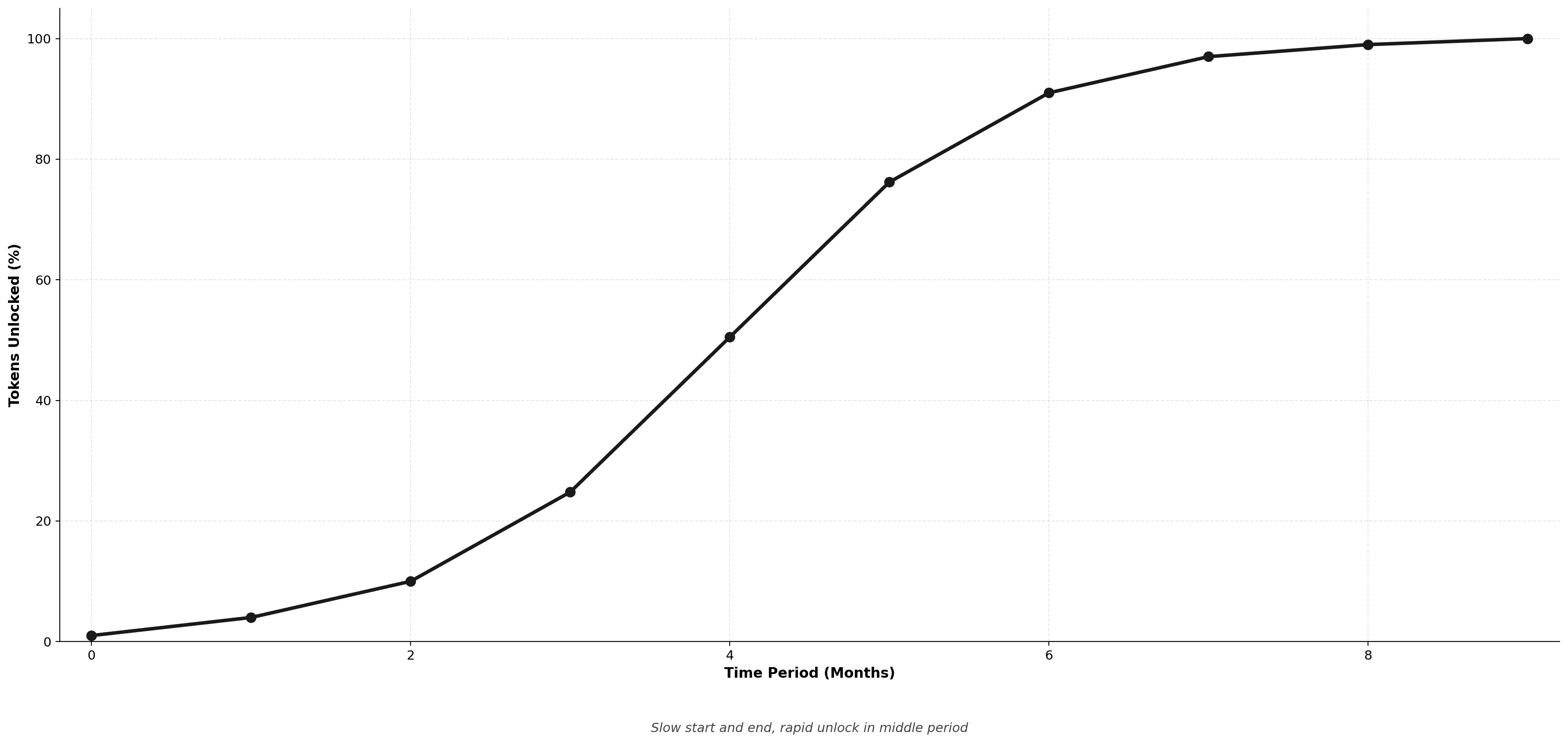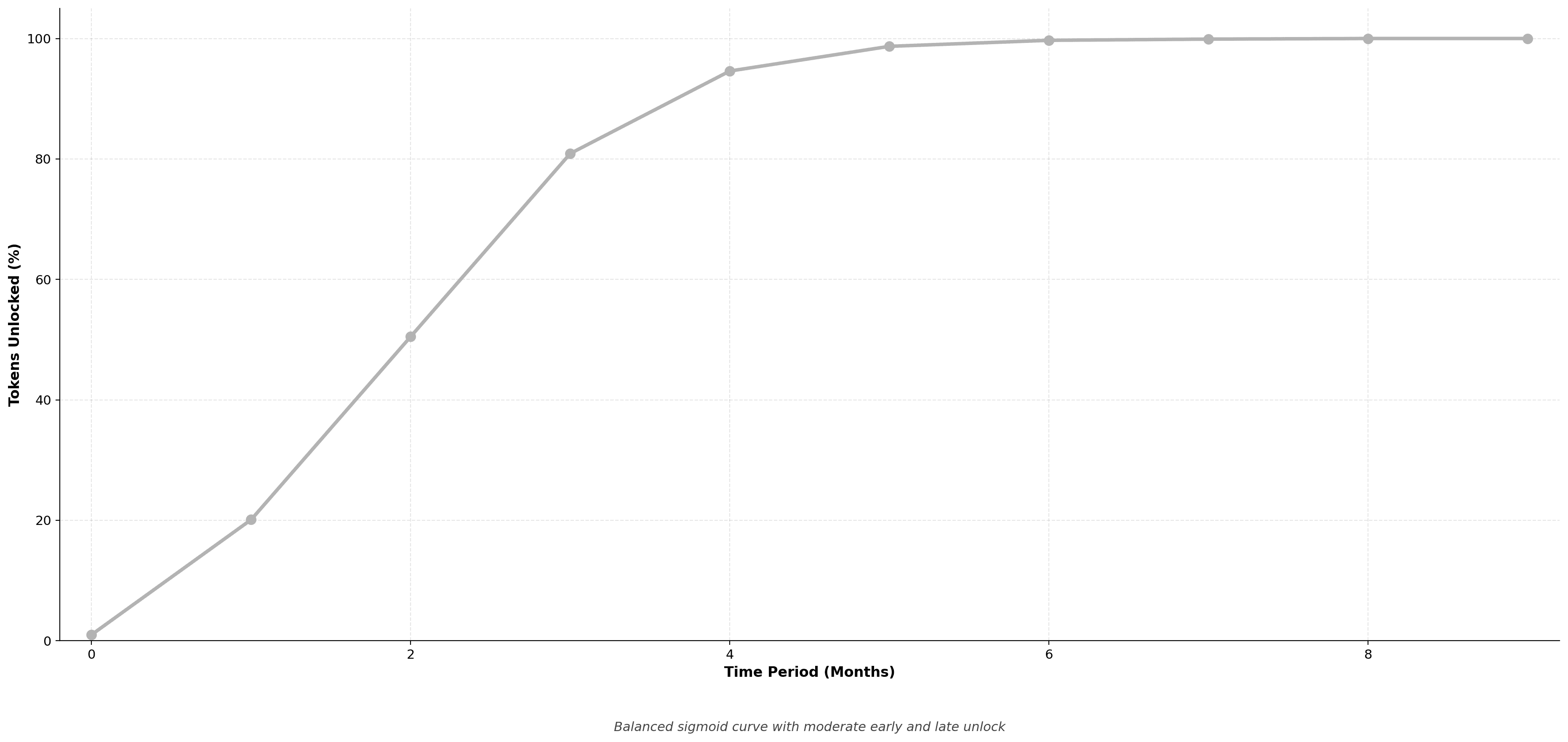 Balanced sigmoid variant with moderate early and late unlock rates. Middle 50% of vesting period sees majority of releases.